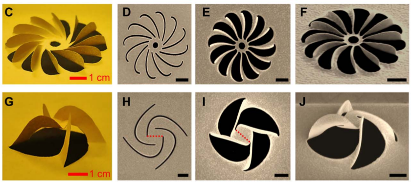Наноаналоги японских техник оригами и киригами, с помощью которых можно из плоского листа бумаги складывать фигурки нужной формы, ученые все чаще предлагают использовать для получения материалов с заданными формой и физическими свойствами. В случае нанооригами превращение двумерной структуры в трехмерную происходит только за счет складывания тонкой пленки материала по определенным линиям в нужной последовательности, а при использовании нанокиригами перед складыванием в этих нанослоях делаются разрезы. Класс материалов, которые можно обрабатывать с помощью такого подхода, довольно широк: это могут быть пленки кремния, металлов или полимеров. Как правило, с помощью нанокиригами получают материалы с необычными механическими или акустическими свойствами, которые способны растягиваться в несколько раз или особым образом отражать звуковые волны.